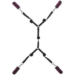 Lege die Gurte unter die Matratze und achte darauf, dass die Manschetten an jeder Ecke des Bettes herausschauen. Befestige die Manschetten mit frechen pinken Details an den Hand- und Fußgelenken deines Spielpartners, je nach Belieben mit dem Gesicht nach oben oder nach unten.