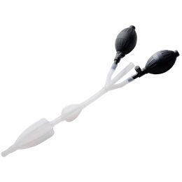 haben, dass die „Ballons“ schnell auslaufen oder kaputtgehen. Ich habe das noch nicht erlebt. Ich habe auch gelesen, dass die Pumpen von schlechter Qualität und schwer zubedienen sind. Ich denke, ansonsten funktionieren sie gut und sehr intuitiv, und sie können leicht ersetzt werden, wenn Sie es noch wollen. Insgesamt ist das Produkt vonguter Qualität. Der Schlauch zwischen den beiden Ballons ist verstärkt, sodass Sie den Fluss nicht durch Zusammendrücken mit dem Schließmuskel unterbrechen können. Ein„Verbindungsstück“ ist nicht dabei, war aber bei mir auch nicht nötig. Der Schlauch ist so breit, dass ein handelsüblicher Klistierschlauch problemlos hineinpasst. DiePumpen haben zwei Einstellungen: „Geschlossen“, wobei Luft durch Drücken der Pumpe in die Ballons eindringen und nicht wieder herauskommen kann. Und „offen“, wobeidie Luft aus den Ballons entweicht, die sich somit auch nicht aufblasen lassen. Wenn sich die Ballons nicht aufblasen lassen, drehen Sie den Metallknopf an der Pumpe, da Siesich wahrscheinlich in der „falschen Einstellung“ befinden. Das Tolle an diesem Produkt ist, dass Sie sich während eines Einlaufs mehr entspannen können. Sie müssennicht ständig drücken, um das Wasser im Inneren zu halten. Und wenn Sie ein bisschen „böse“ sind, dann können Sie die Kontrolle an jemand anderen abgeben, derentscheidet, wann Sie das Wasser abstellen dürfen. Solange der Ballon aufgeblasen ist, kann Wasser nicht wirklich wieder herauskommen. Aber Vorsicht: Wenn Sie wirklichversuchen, den Ballon im aufgeblasenen Zustand herauszudrücken, dann können Sie es wahrscheinlich schaffen oder ihn vielleicht sogar „sprengen“. Das Produkt hat keinenschlechten Geruch, keine scharfen Kanten oder sonstige unangenehme Dinge. Probleme: 1: Das Produkt ist qualitativ nicht so hochwertig. An einigen Stellen hatte es ganz kleinebraune Verfärbungen, und ganz am Ende, wo das Wasser rauskommt, war der Schnitt nicht ganz sauber ausgeführt. Es gab keine scharfen Kanten, aber im Inneren des Schlauchsbefand sich etwas überschüssiges Silikon, das nicht vollständig entfernt worden war. 2: Das Produkt ist ziemlich groß. Ich kann nur den oberen Ballon einführen und danngeht das Produkt eigentlich nicht weiter hinein. Außerdem sind die beiden Ballons meiner Meinung nach etwas zu weit voneinander entfernt, und diese beiden Probleme zusammenführen dazu, dass die Ballons die meiste Zeit nicht sehr nahe beieinander sind. Fast die ganze Arbeit wird vom inneren Ballon erledigt, während der äußere Ballon einenganzen Zentimeter vom Anus entfernt hängt und absolut nichts tut. Allerdings helfen dabei einige Positionen, z. B. auf den Knien mit dem Kopf nach unten. 3: Da das Produktziemlich groß ist, muss ich Gleitgel verwenden, um es sanft einführen zu können. Das geht zwar auch problemlos ohne Gleitgel, aber dann habe ich Angst, die Ballons zubeschädigen.